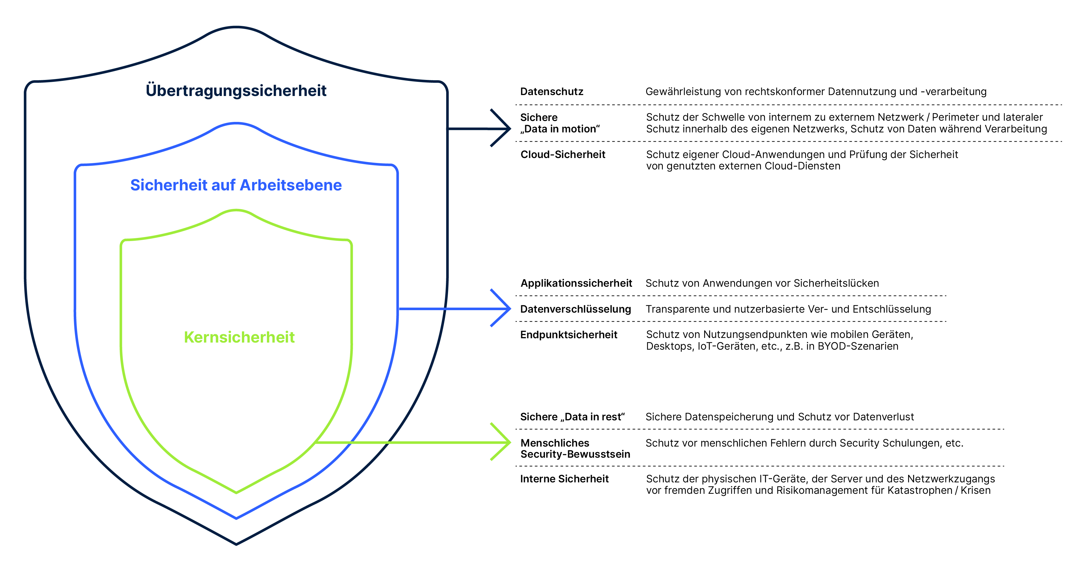 Zum Schutz des eigenen IT-Netzwerkes zählt zum einen die Absicherung sämtlicher sich im Netzwerk befindlichen Daten, Geräte, Server und Applikationen (Datensicherheit, interne Sicherheit und Applikationssicherheit), zum anderen aber auch Perimeter Security, also die Absicherung der Schwelle zwischen internem und externem Netz – demnach auch sichere Übertragungswege und Netzwerkzugänge (Endpunktsicherheit und Datenverschlüsselung).