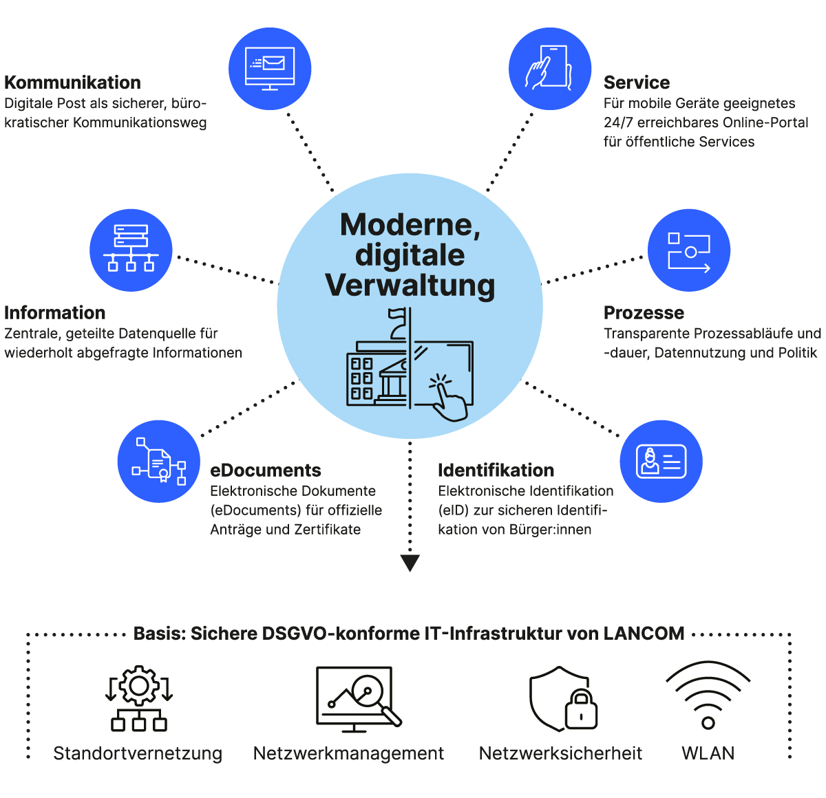 Die Digitalisierung der Verwaltung ist mehr als eine schöne Nutzeroberfläche – sie erfordert einen tiefgreifenden Wandel, oft eine ganz neue Sicht auf Verwaltungsprozesse. Erreichbarkeit, Zugriff und Datenschutz, Vernetzung und modernes Arbeiten – für all das ist ein sicheres, stabiles und performantes IT-Netzwerk die Grundvoraussetzung.