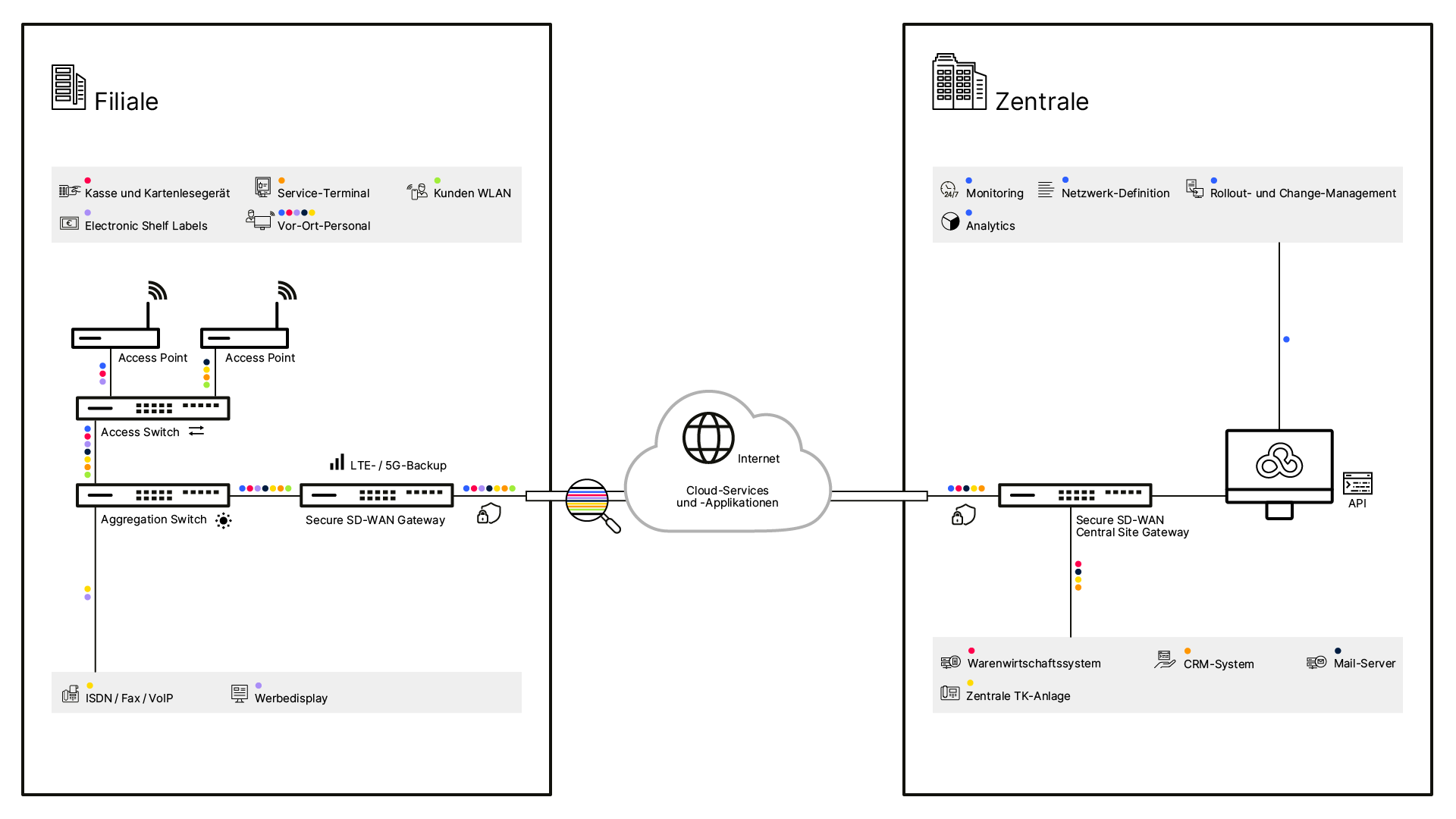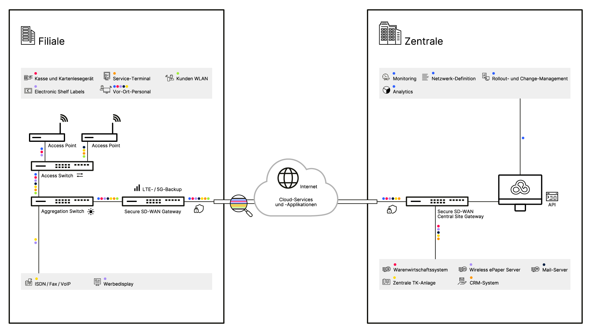 Intelligente Netzwerkautomatisierung für Filialen Ausfallsichere, Cloud-fähige Netzwerkkomponenten wie SD-WAN Gateways, Next-Generation Firewalls, Hochleistungs-Switches und Wi-Fi 6E- und Wi-Fi 7-fähige Access Points mit zero-touch Rollout und Deployment, Monitoring und automatischer Konfiguration aus der Ferne.