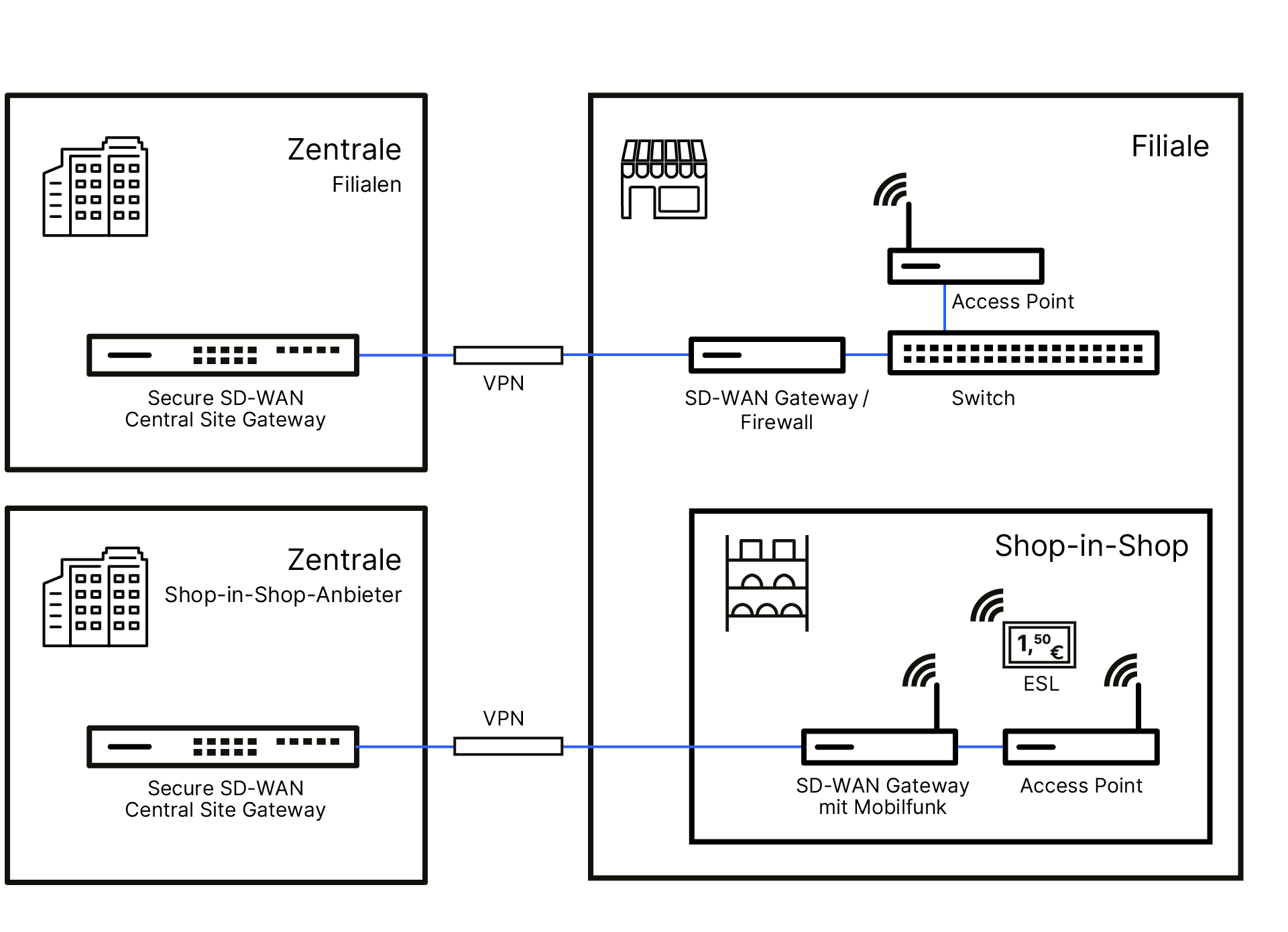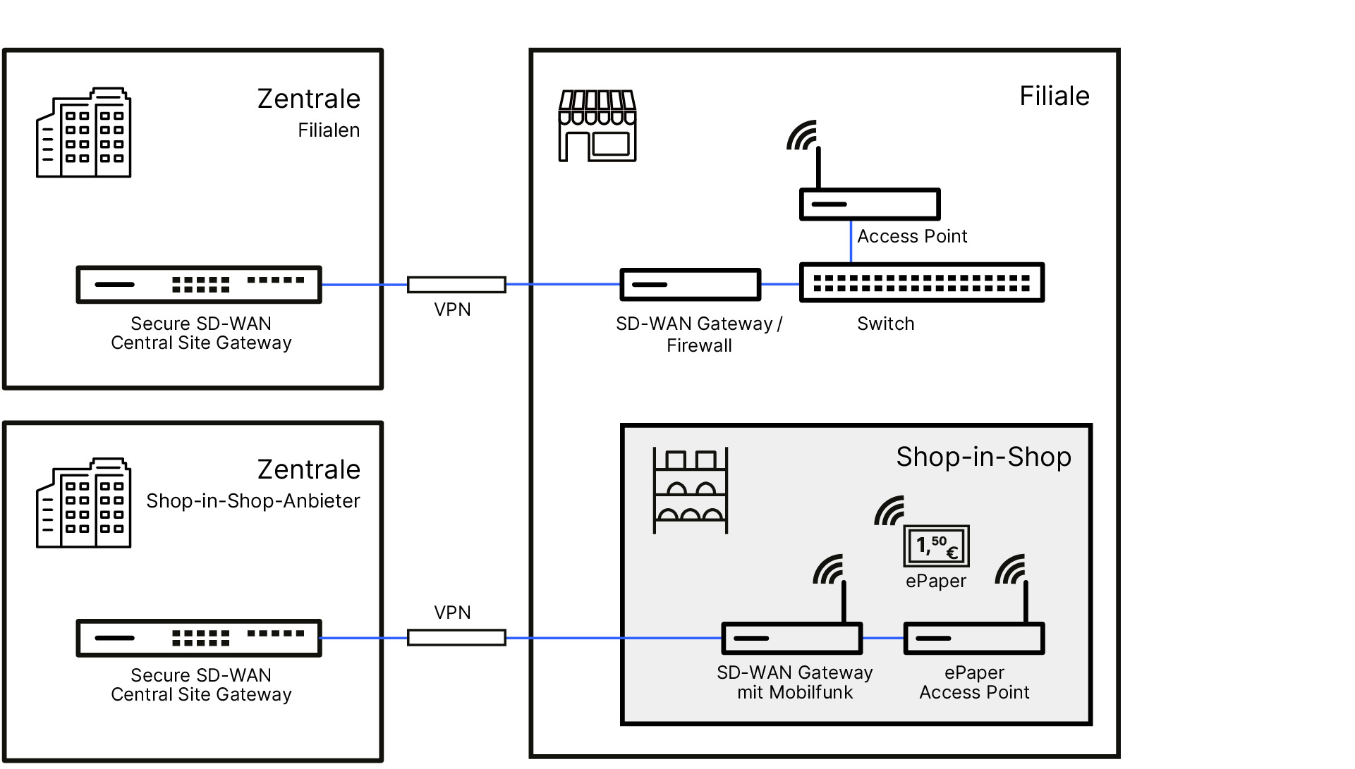 So können sowohl die Filiale, in der sich der Shop-in-Shop befindet, als auch der Shop-in-Shop unabhängig voneinander und höchst performant an ihre jeweiligen Zentralen angeschlossen werden. Durch einen VPN-Tunnel gesichert, bleibt der Datenfluss für beide stetig und geschützt.