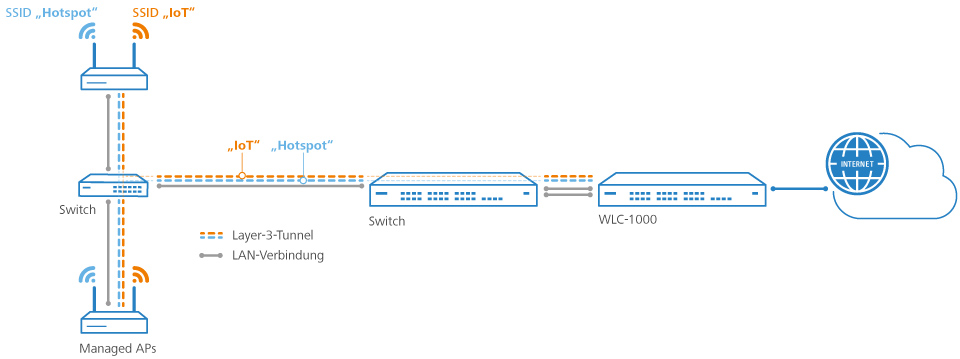 - DHCP Option 82: Dieses Feature ermöglicht die Zuweisung von IP-Adressen auf Basis der SSID, mit der ein Gerät verbunden ist. Access Points fügen per DHCP Option 82 eine Circuit-ID hinzu, über die der DHCP-Server IP-Adressen standortbezogen vergeben kann. Dies vereinfacht die Netzüberwachung und verbessert die Übersichtlichkeit.