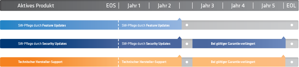 Damit Sie stets den Überblick über unsere aktuellen und End of Sale-Produkte bewahren, haben wir für Sie verschiedene Tabellen erstellt. Diese zeigen Ihnen all unsere Produkte mit End of Sale-Datum, welche Software-Version sie unterstützen, sowie Informationen über den Zeitraum weiterer Feature-Updates und technischem Hersteller-Support.