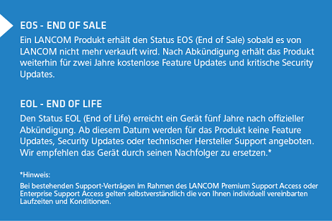 Den Status EOL (End of Life) erreicht ein Gerät fünf Jahre nach offizieller Abkündigung. Ab diesem Datum endet der Hardware- bzw. Austausch-Service für Reparaturen und Ersatzteile. Zudem werden für das Produkt keine Major-, Minor-, Release- sowie Security Updates oder technischer Hersteller-Support mehr angeboten, solange Sie keine individuellen Laufzeiten und Konditionen in Support-Verträgen vereinbart haben (für die LANCOM R&S®Unified Firewalls gelten gesonderte Regelungen).