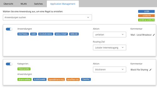 Welche Anwendungen Sie in Ihren Netzwerken erlauben oder blockieren, können Sie jetzt noch einfacher in der LANCOM Management Cloud verwalten. Als Nachfolger des bisherigen Application Routing gruppieren Sie mit dem neuen Application Management mehrere Anwendungen in einer gemeinsamen Regel. Diesen weisen Sie bestimmte Aktionen zu, etwa "Umleiten" oder "Blockieren". Mit wenigen Klicks erhöhen Sie die Sicherheit des Netzwerkes und steigern durch Local Breakouts definierter Anwendungen zusätzlich die Performance.