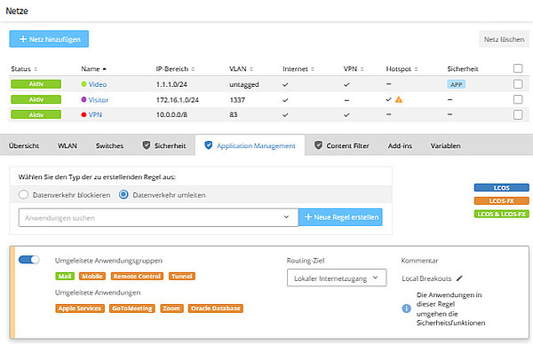 Steigern Sie die Gesamtperformance Ihres Netzwerkes durch die Aussteuerung bestimmten Datenverkehrs (Application Steering): Von Ihnen als vertrauenswürdig eingestufte Applikationen wie z.B. Microsoft 365 können über einen lokalen Internetzugang (Local Internet Breakout) ohne Umwege direkt ins Internet geroutet werden. Mit nur wenigen Klicks werden zentrale Konfigurationen des Application Managements aus der LANCOM Management Cloud (LMC) automatisiert und sicher auf alle Standorte angewendet. Erstellen Sie dazu unter Netze > Application Management > „Datenverkehr umleiten“ eigens definierte Regeln jetzt auch mit "LCOS FX" markierten Anwendungen und erweitern Sie die Vorteile der Unified Firewalls in Kombination mit der LMC.