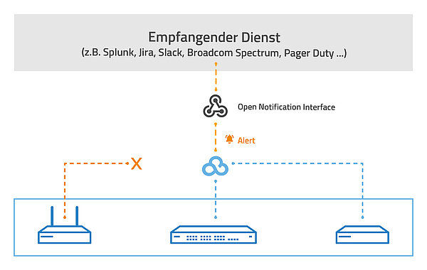 Um frühzeitig reagieren zu können, müssen Administratoren unmittelbar bei Eintreten eines Netzwerkereignisses benachrichtigt werden. Dank des Open Notification Interface können nun gesammelte Alarme über verschiedene Ereignisse an jeden Empfänger-Dienst wie z.B. Slack, Jira oder Splunk weitergeleitet werden, der eine Kommunikation mit der LMC auf Basis der Webhook-Technologie ermöglicht. Dadurch können Nutzer die Benachrichtigungen flexibel in ihre übliche Arbeitsumgebung integrieren und ebenfalls mit Alarmen von Fremdherstellersystemen zusammenführen.