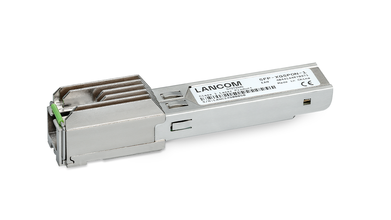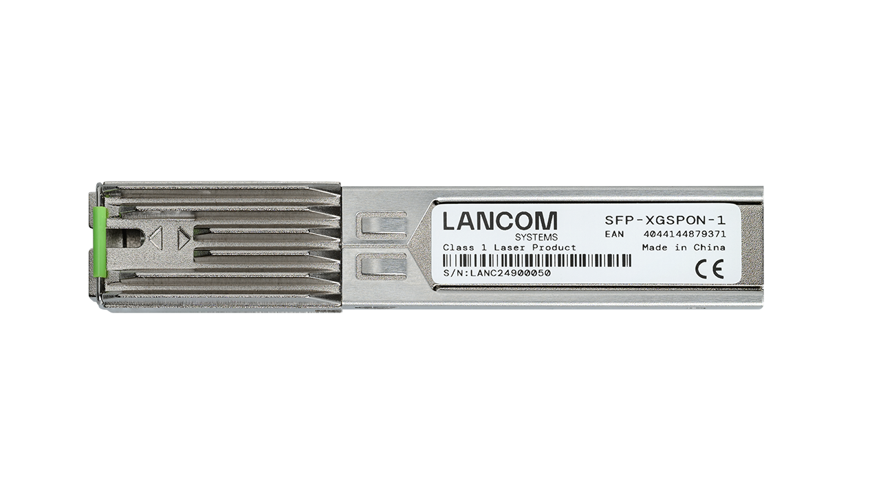 Hinweis: Zur Nutzung des LANCOM SFP-XGSPON-1 ist geräteseitig mindestens die LCOS-Version LCOS 10.80 RU9 erforderlich. Der Anschluss des Moduls an 1G SFP-Ports begrenzt die max. Datenübertragung entsprechend auf 1 GBit/s.