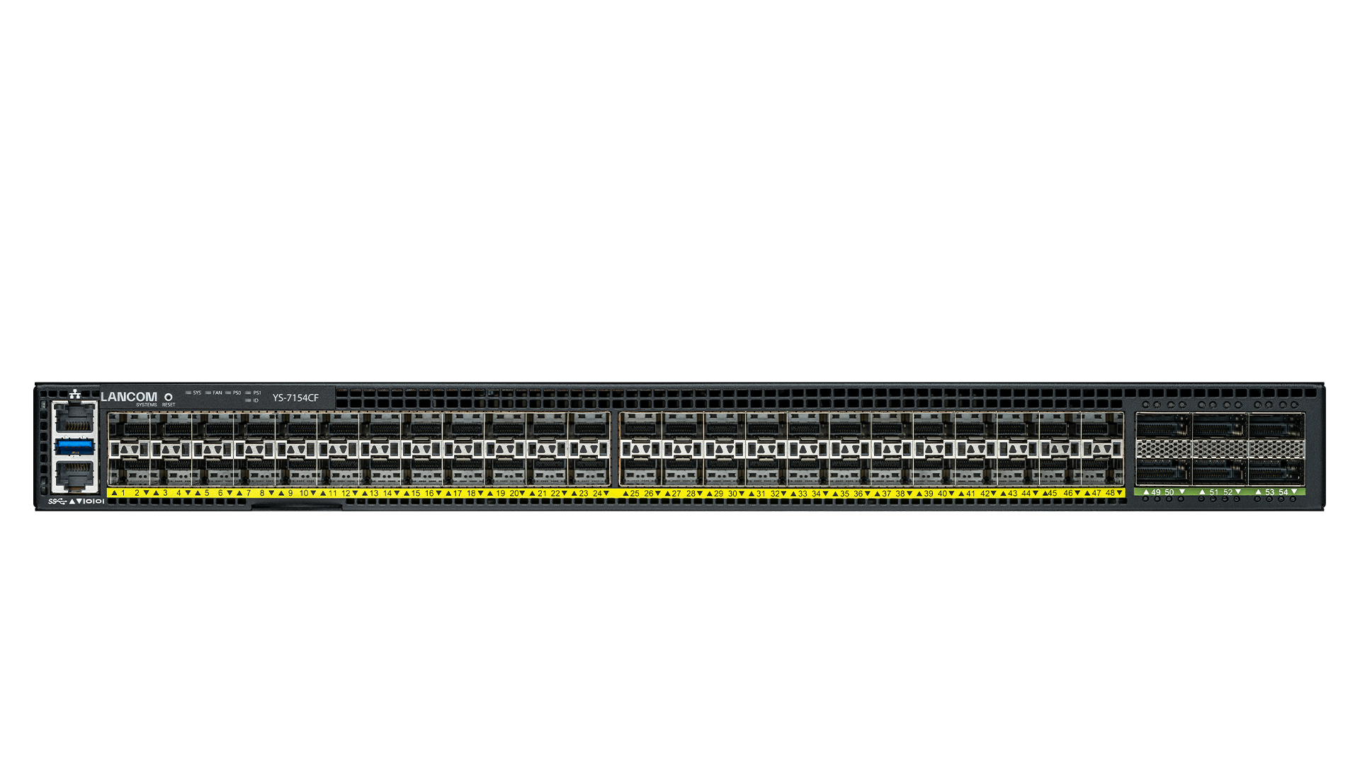 Der 25G Stackable Fiber Aggregation Switch sorgt in datenintensiven, verteilten Campus-Netzwerken für die notwendige Performance und Hochverfügbarkeit der Netzwerkressourcen. Für erhöhte Ausfallsicherheit und einen unterbrechungsfreien Austausch ist der LANCOM YS-7154CF standardmäßig mit zwei, im laufenden Betrieb, austauschbaren Netzteilen (PSU) sowie fünf hot-swappable Lüftern (mit n+1 Redundanz) ausgestattet.