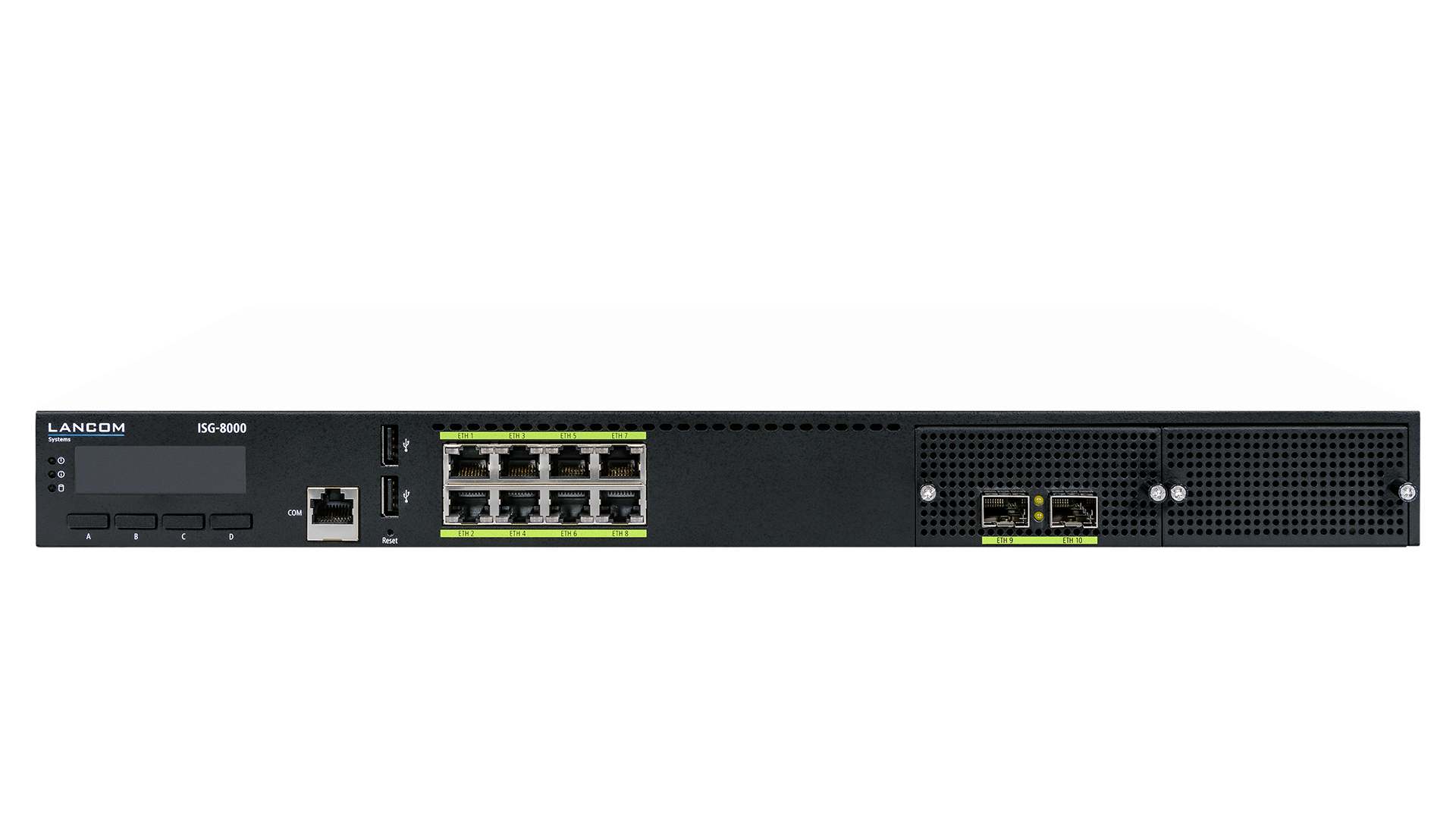 Das LANCOM ISG-8000 kommt im hochwertigen Vollmetall-Gehäuse mit 2 redundanten Netzteilen. Dank Montagevorrichtung lässt es sich in einem 19"-Rack installieren – nach vorne geführte Anschlüsse sorgen darüber hinaus für einen schnellen, praktischen Zugriff. Das in der Frontseite eingelassene Display zeigt permanent verschiedene Geräteinformationen an, beispielsweise Temperatur, CPU-Auslastung und aktive VPN-Tunnel. Damit haben Sie die Parameter Ihres Netzwerkes sofort im Blick und wissen, ob Handlungsbedarf besteht.