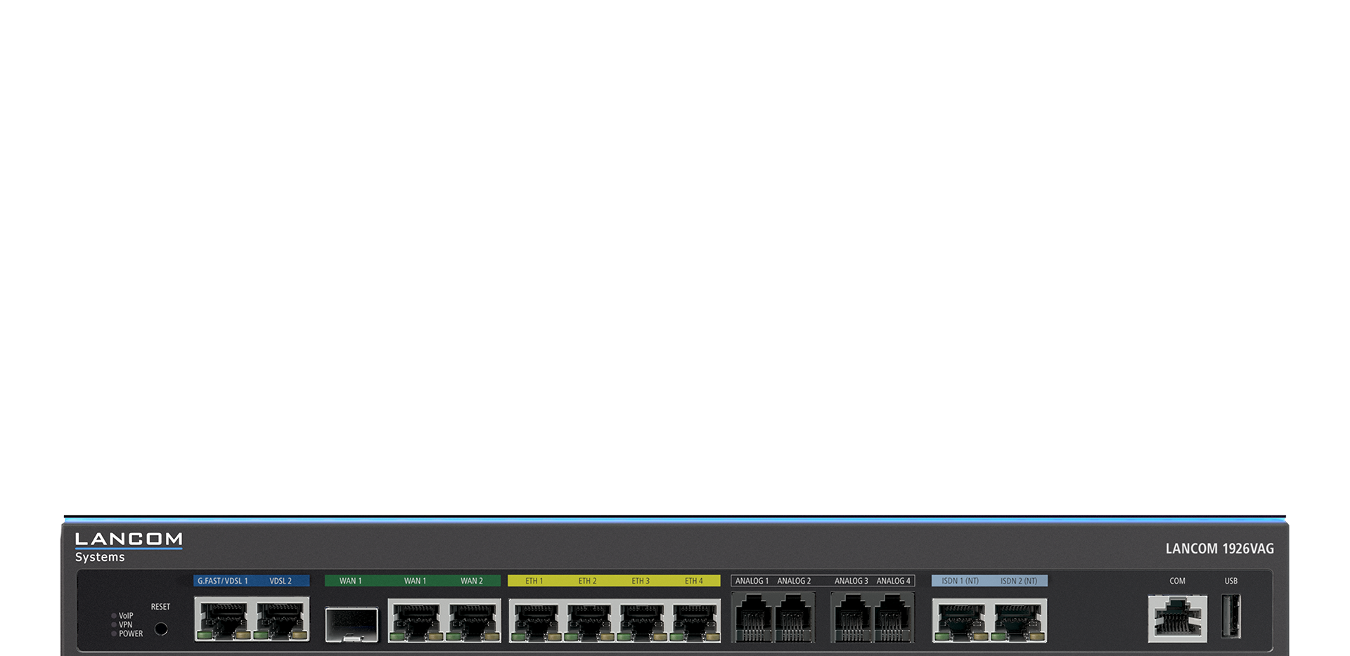 - Professionelle Telefoniefunktionen durch integrierten LANCOM VCM (Voice Call Manager) / SBC (Session Border Controller)