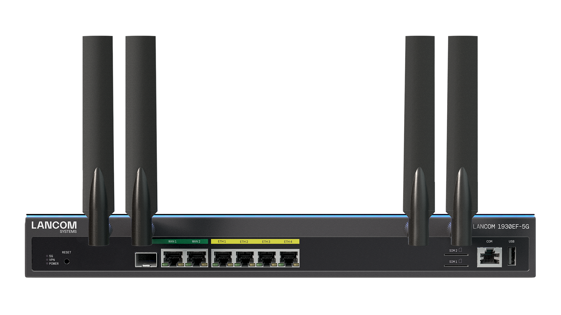 Dank der zwei inkludierten SIM-Karten-Slots und hochperformanter 5G-Technologie ist der LANCOM 1930EF-5G ideal für intelligente Backup-Szenarien, den Primärbetrieb oder den Parallelbetrieb im Active/Active-Modus mit anderen Zugangsarten. Höchste Verfügbarkeit und beste Bandbreiten für die Nutzung von Echtzeitanwendungen wie Videostreaming oder Augmented Reality (AR) im Zusammenspiel mit niedrigsten Latenzen machen das SD-WAN Gateway zum idealen Knotenpunkt in Umgebungen mit hohem Datenaufkommen.