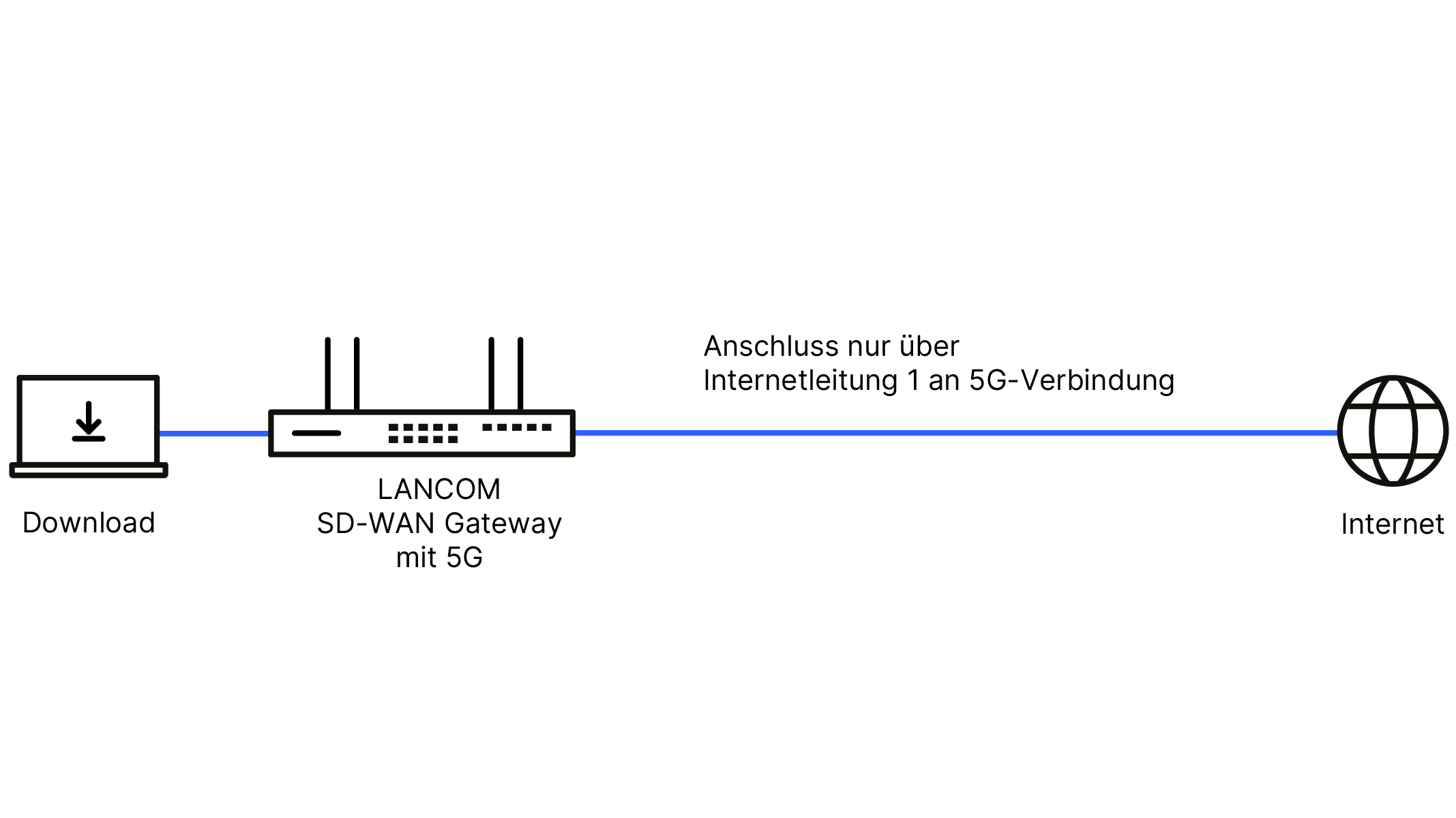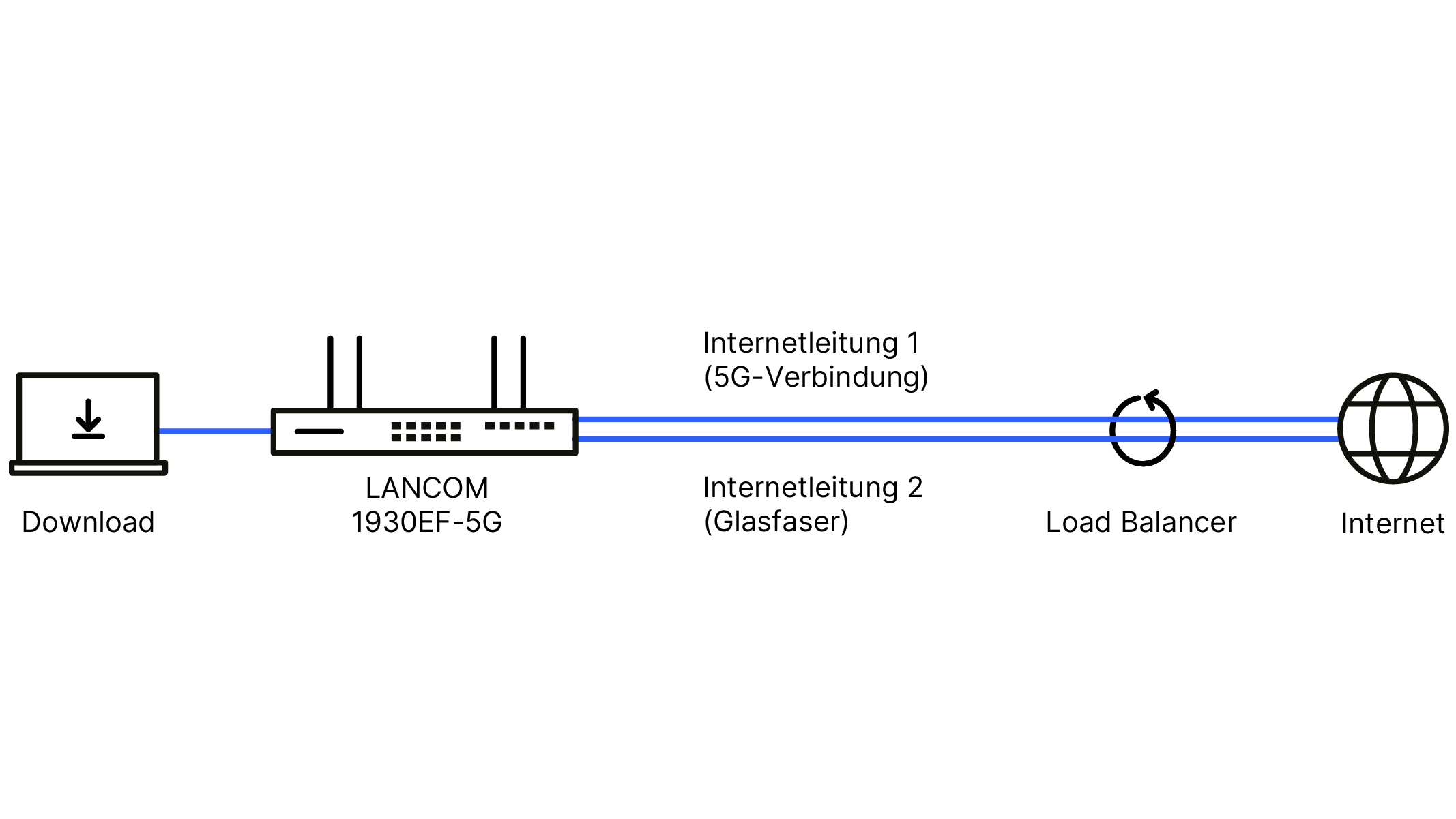 Ein Client ist über den LANCOM 1930EF-5G im Active/Active-Betrieb (Load Balancing) mit dem Internet verbunden. Load Balancing dient hierbei zur Lastverteilung des Datenaufkommens im Netzwerk auf parallel genutzte Internetleitungen. So werden Datenverbindungen ausgeglichen über (mindestens) zwei Leitungen aufgeteilt und die Einzelbandbreiten der Leitungen aufsummiert. Der im SD-WAN Gateway integrierte Load Balancer entscheidet sich in diesem Szenario je nach Auslastung für die Internetleitung 1 (5G) oder die Internetleitung 2 (Glasfaser). Selbst bei Ausfall einer Leitung ist die Verbindung über die andere Leitung stets abgesichert.