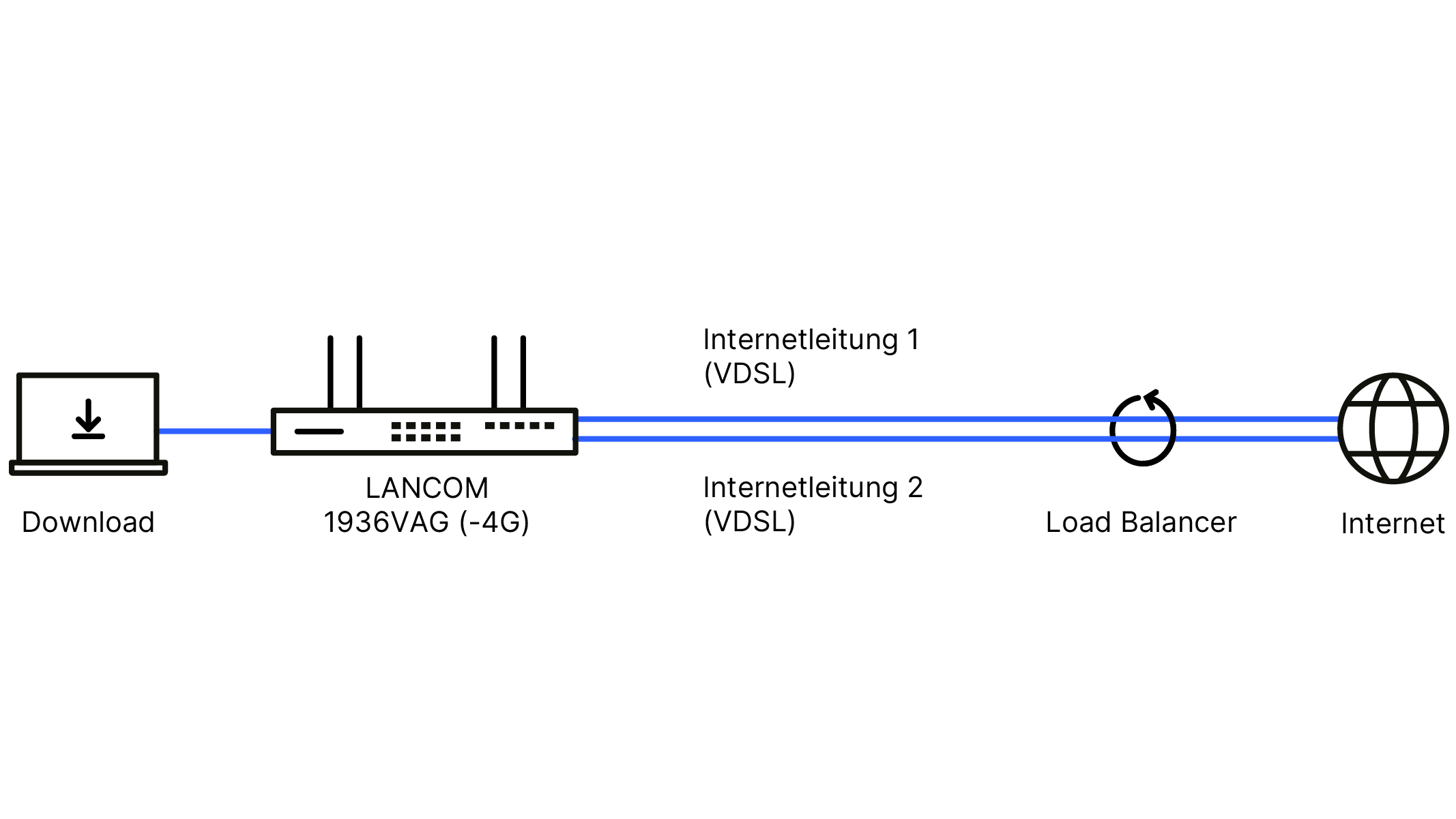 Ein Client ist über das Multi-WAN SD-WAN Gateway im Active/Active-Betrieb (Load Balancing) mit dem Internet verbunden. Load Balancing dient hierbei zur Lastverteilung des Datenaufkommens im Netzwerk auf parallel genutzte Internetleitungen. So werden Datenverbindungen ausgeglichen über (mindestens) zwei Leitungen aufgeteilt und die Einzelbandbreiten der Leitungen aufsummiert (2x 300 MBit/s = 600 MBit/s). Der im SD-WAN Gateway integrierte Load Balancer entscheidet sich in diesem Szenario je nach Auslastung für die Internetleitung 1 oder Internetleitung 2 (je 300 MBit/s VDSL-Supervectoring). Selbst bei Ausfall einer Leitung ist die Verbindung über die andere Leitung stets abgesichert.