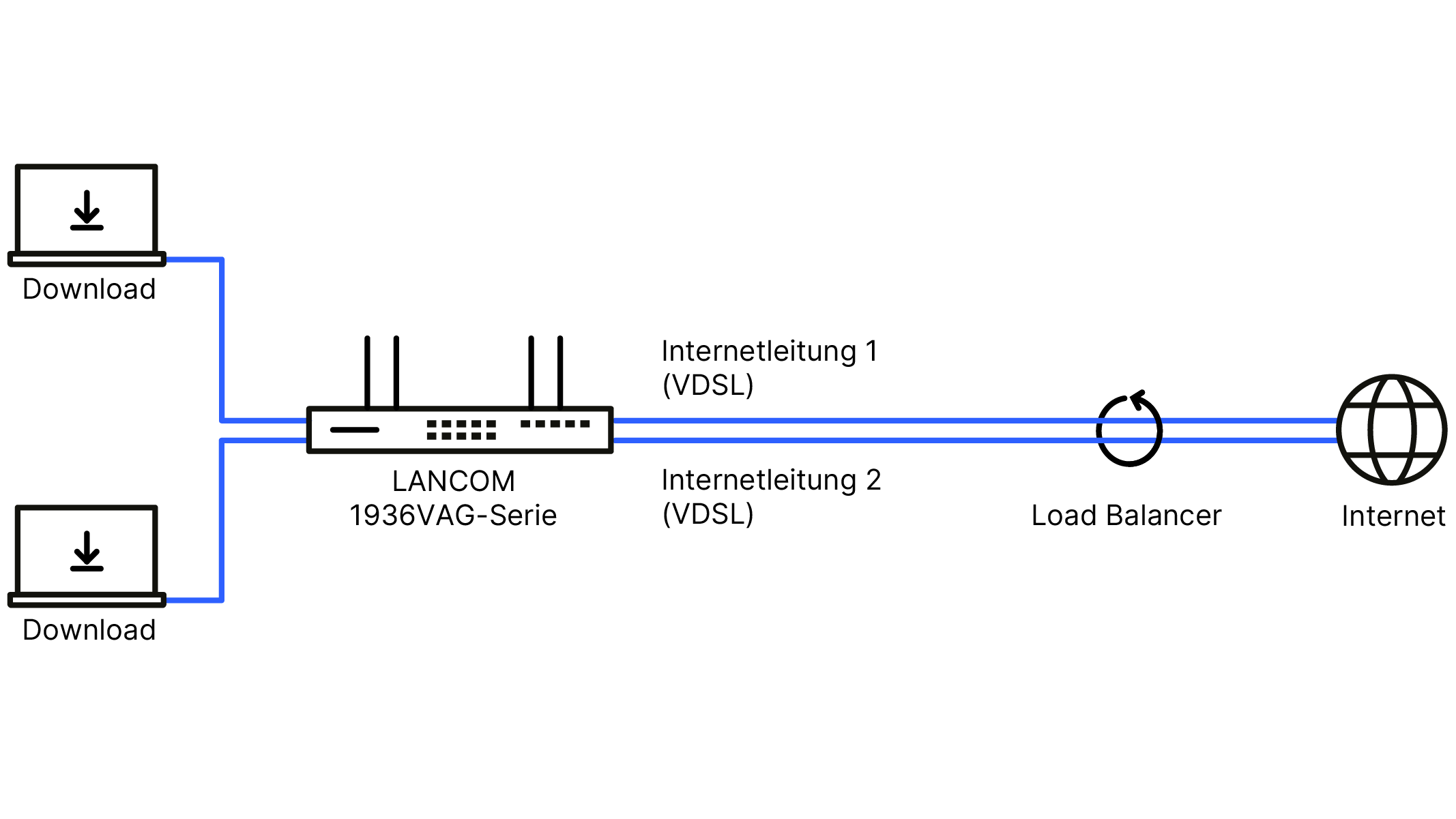 Mehrere Clients sind über das Multi-WAN SD-WAN Gateway und VDSL-Supervectoring mit dem Internet verbunden. Nun können z. B. zwei Clients mit im Router integriertem Load Balancer parallel mit jeweils 300 MBit/s Downloadgeschwindigkeit arbeiten, denn dieser ermöglicht die Aufteilung der Datenlast auf beide Internetleitungen. Damit kann eine maximale Auslastung von 600 MBit/s und daraus folgend eine enorme Netzwerk-Effektivitätssteigerung realisiert werden.