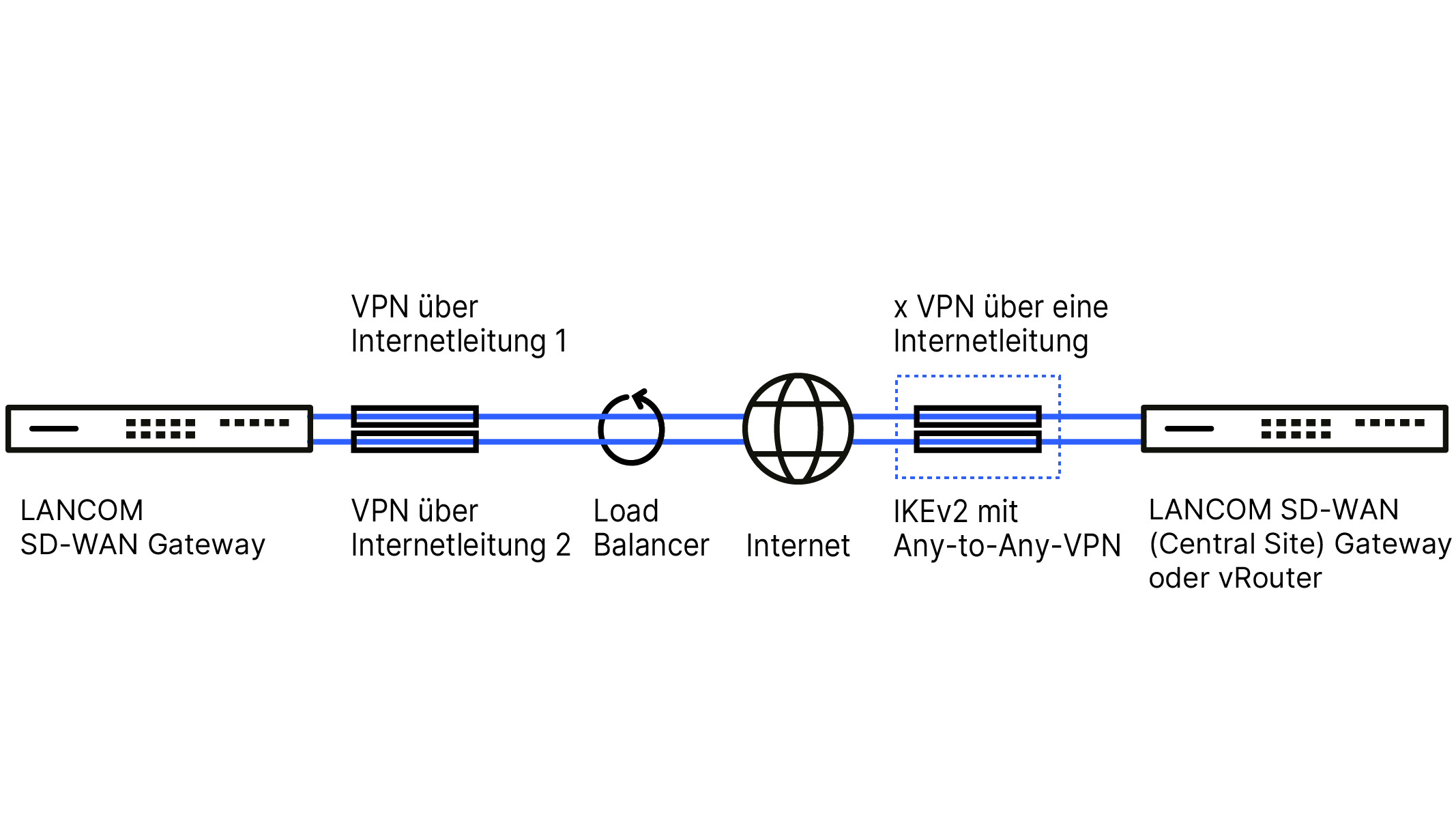 Mit dem integrierten Load Balancer können auch bequem IKEv2-VPN-Verbindungen zu einem Load Balancer-Verbund zusammengefasst werden. Unabhängig davon, ob der Verbund mit einem LANCOM SD-WAN Gateway, einem LANCOM SD-WAN Central Site Gateway (z. B. LANCOM ISG-5000) oder dem LANCOM vRouter realisiert wird – durch den Zusammenschluss wird die Last besser verteilt und der Datenverkehr bei Ausfall einer Verbindung automatsch übernommen. Dadurch steigert sich die VPN-Bandbreite für mehrere Clients deutlich.
