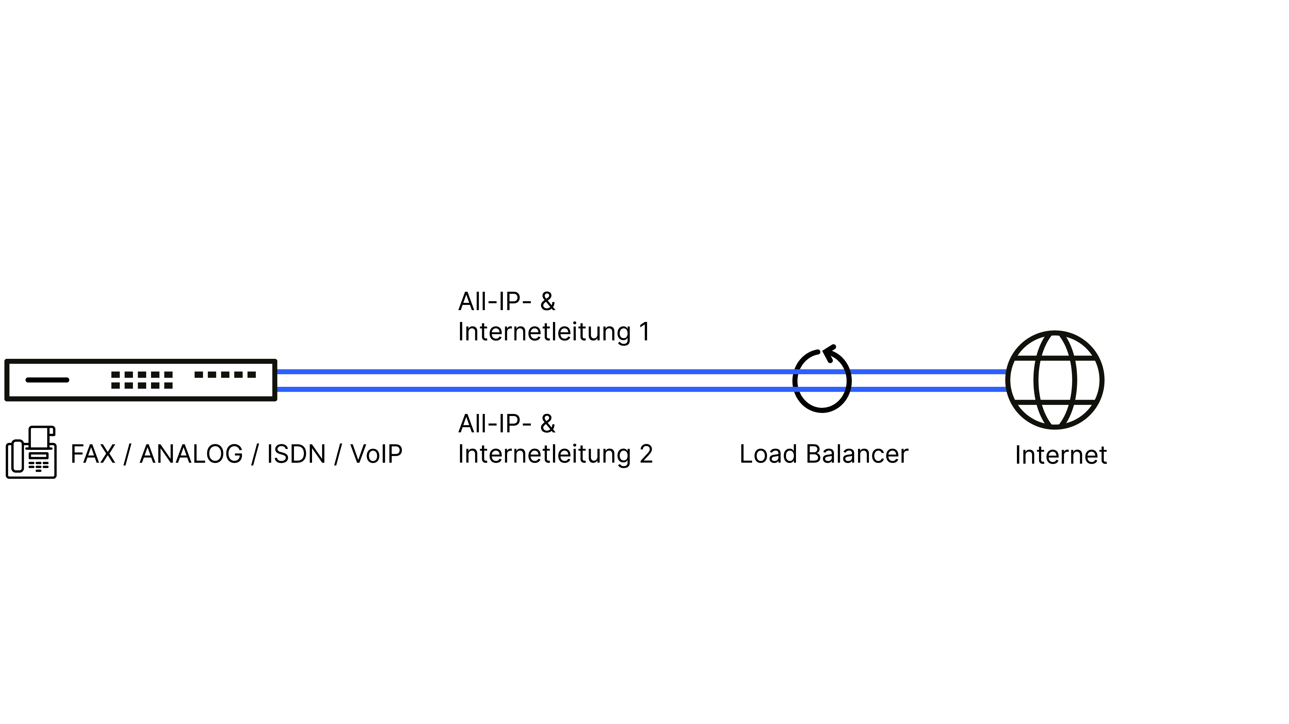 Durch den integrierten Voice Call Manager und Session Border Controller ist das Multi-WAN SD-WAN Gateway ideal für eine nahtlose Migration von ISDN / Analog zu All-IP. SIP-Leitungen können dabei nach Belieben fest an gewünschte Internet-Verbindung (All-IP-Leitung 1 oder 2) gebunden werden. Der Load Balancer wird für die Verteilung des Internetverkehrs genutzt.
