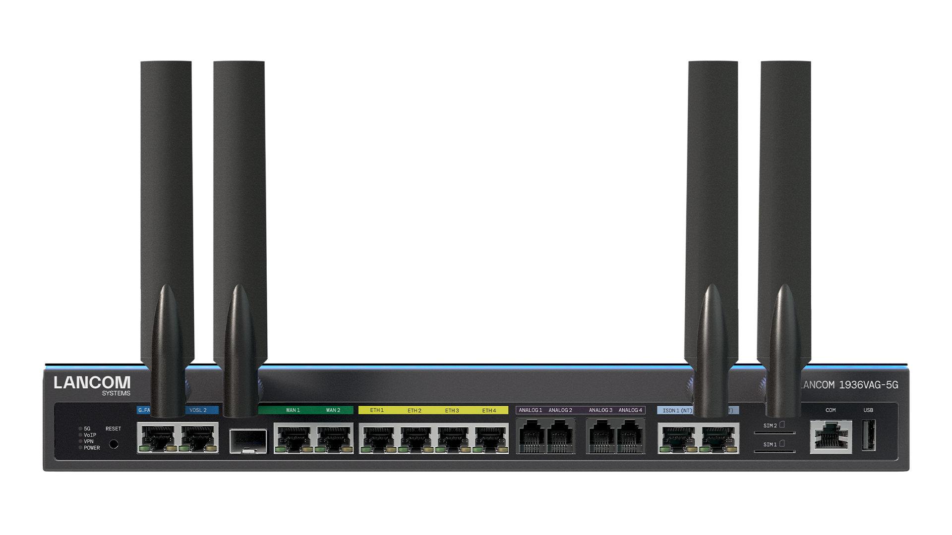 Dank der zwei inkludierten SIM-Karten-Slots und hochperformanter 5G-Technologie ist der LANCOM 1936VAG-5G ideal für intelligente Backup-Szenarien, den Primärbetrieb oder den Parallelbetrieb im Active/Active-Modus mit anderen Zugangsarten. Höchste Verfügbarkeit und beste Bandbreiten für die Nutzung von Echtzeitanwendungen wie Videostreaming oder Augmented Reality (AR) im Zusammenspiel mit niedrigsten Latenzen machen das SD-WAN Gateway zum idealen Knotenpunkt in Umgebungen mit hohem Datenaufkommen.