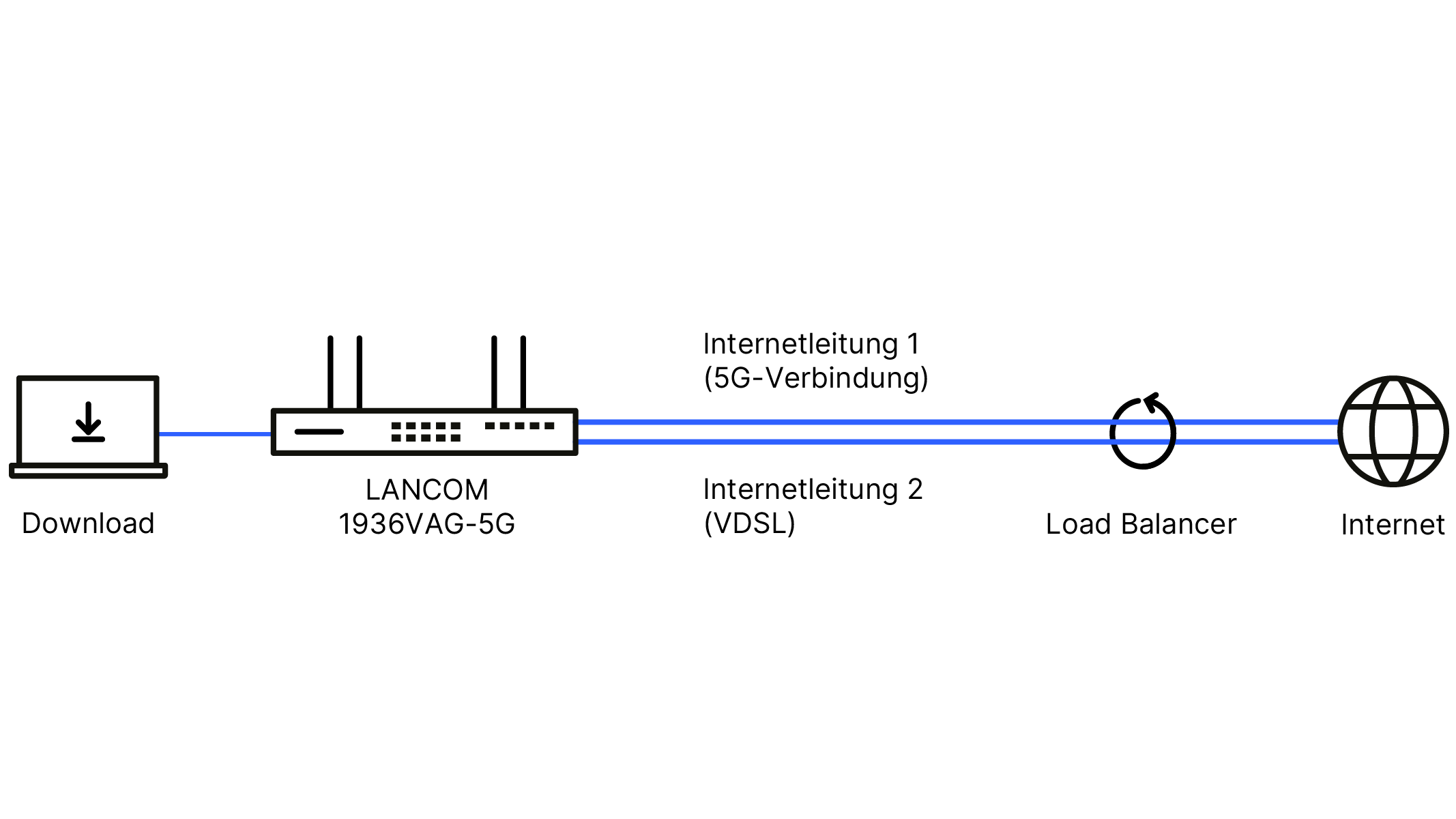 Ein Client ist über den LANCOM 1936VAG-5G im Active/Active-Betrieb (Load Balancing) mit dem Internet verbunden. Load Balancing dient hierbei zur Lastverteilung des Datenaufkommens im Netzwerk auf parallel genutzte Internetleitungen. So werden Datenverbindungen ausgeglichen über (mindestens) zwei Leitungen aufgeteilt und die Einzelbandbreiten der Leitungen aufsummiert. Der im SD-WAN Gateway integrierte Load Balancer entscheidet sich in diesem Szenario je nach Auslastung für die Internetleitung 1 (5G) oder die Internetleitung 2 (VDSL-Supervectoring). Selbst bei Ausfall einer Leitung ist die Verbindung über die andere Leitung stets abgesichert.