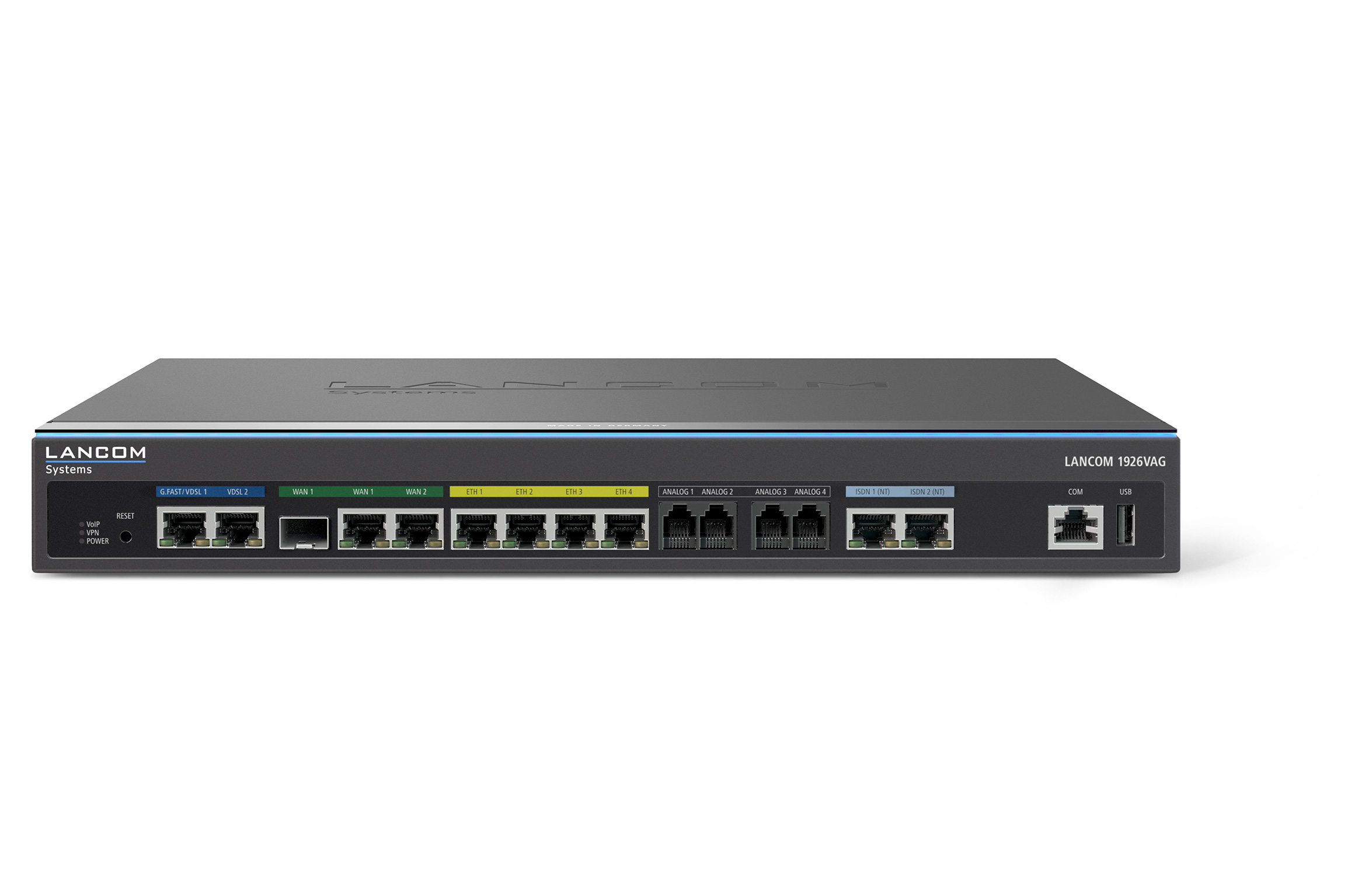Dieses high-end SD-WAN Gateway kombiniert erstmals zwei VDSL-Supervectoring-Modems in nur einem Gerät für eine Bandbreite von 2x 300 MBit/s durch gleichzeitige Nutzung beider Anschlüsse. Alternativ kann das Gerät auch an einem G.Fast-Gigabit-Anschluss betrieben werden. Ausgestattet mit state-of-the-art SD-WAN-Technologie für sichere und automatisierte VPN-Standortvernetzung ist der LANCOM 1926VAG die Top-Lösung in mittelgroßen und großen Filialinfrastrukturen.