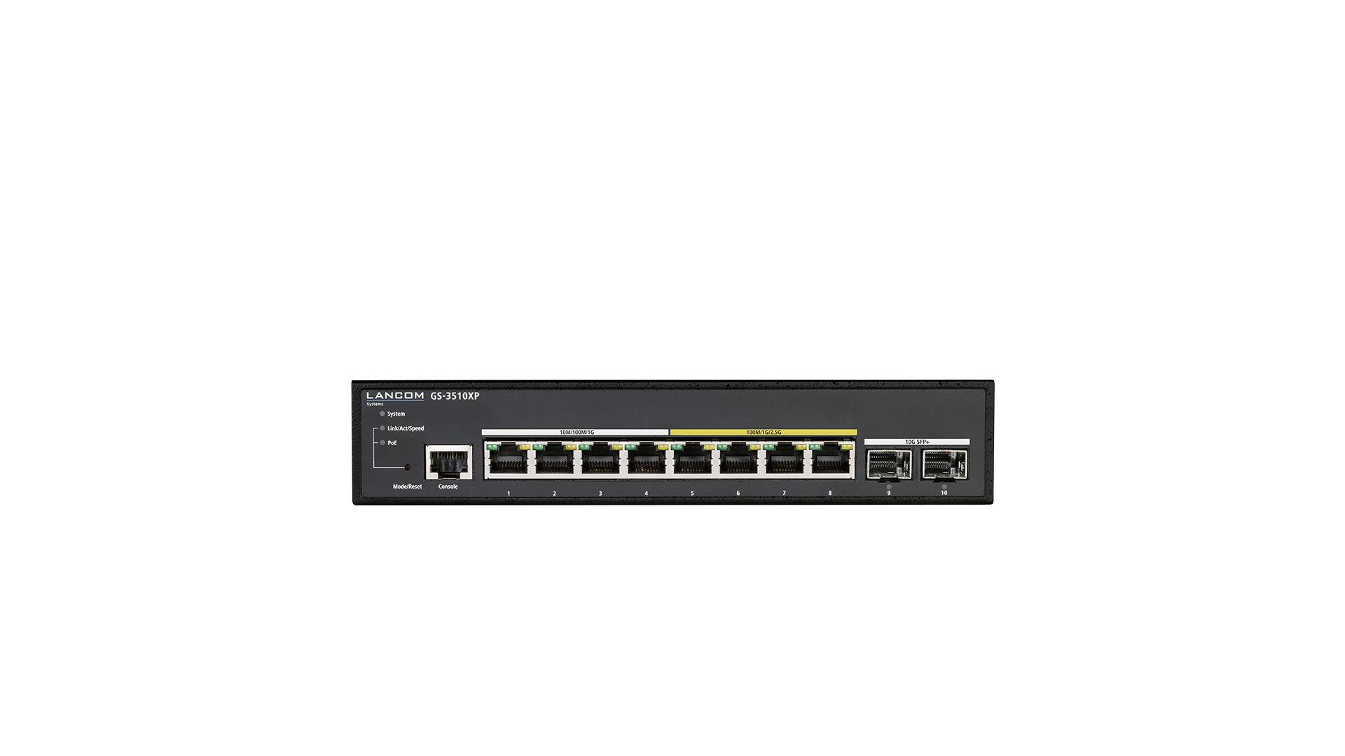 Der LANCOM GS-3510XP ist ausgestattet mit 4x 2,5G- und 4x 1G-Ethernet-Ports sowie 2x 10G-SFP+-Uplink-Ports. Mit einem Datendurchsatz von 68 GBit/s auf der Backplane bietet er volle Performance auch bei hoher Auslastung. Damit bildet der Switch die leistungsstarke Grundlage für moderne Netzwerkinfrastrukturen in Small und Home Offices.