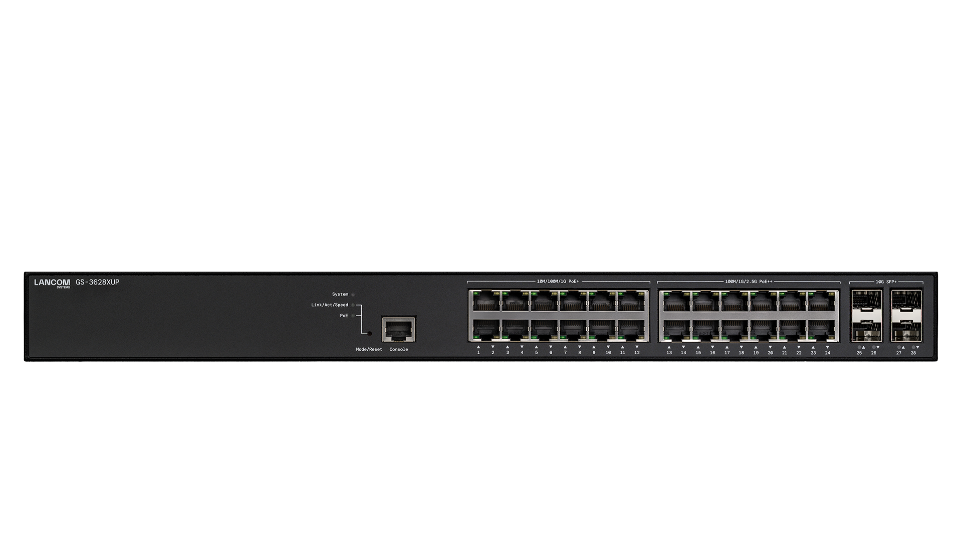 Der LANCOM GS-3628XUP ist dank 12 leistungsstarken 2,5 Gigabit Ethernet-Ports inklusive PoE nach IEEE 802.3bt (PoE++) die ideale Grundlage für die Integration des neuen WLAN-Standards Wi-Fi 6E in moderne Infrastrukturen. Denn Wi-Fi 6E Access Points wie der neue LANCOM LX-6500 mit 4 Streams und je 3 Bändern bedeuten einerseits erhöhte Performance-Ansprüche, die einfaches Gigabit Ethernet übersteigen, andererseits übersteigt die Leistungsaufnahme dieser Access Points erstmals die Schwelle von klassischem PoE+ mit 30W.