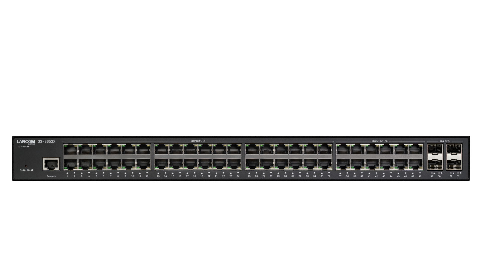 Der LANCOM GS-3652X ist ausgestattet mit 12 2,5 Gigabit Ethernet- und 36 Gigabit Ethernet-Ports sowie 4 SFP+-Ports, die Übertragungsraten von bis zu 10 GBit/s unterstützen. Zudem bietet er mit einem Datendurchsatz von 212 GBit/s auf der Backplane volle Performance auch bei hoher Auslastung. Damit bildet der Access Switch die leistungsstarke Grundlage für große Netzwerkinfrastrukturen in sämtlichen Branchen und Einsatzbereichen.