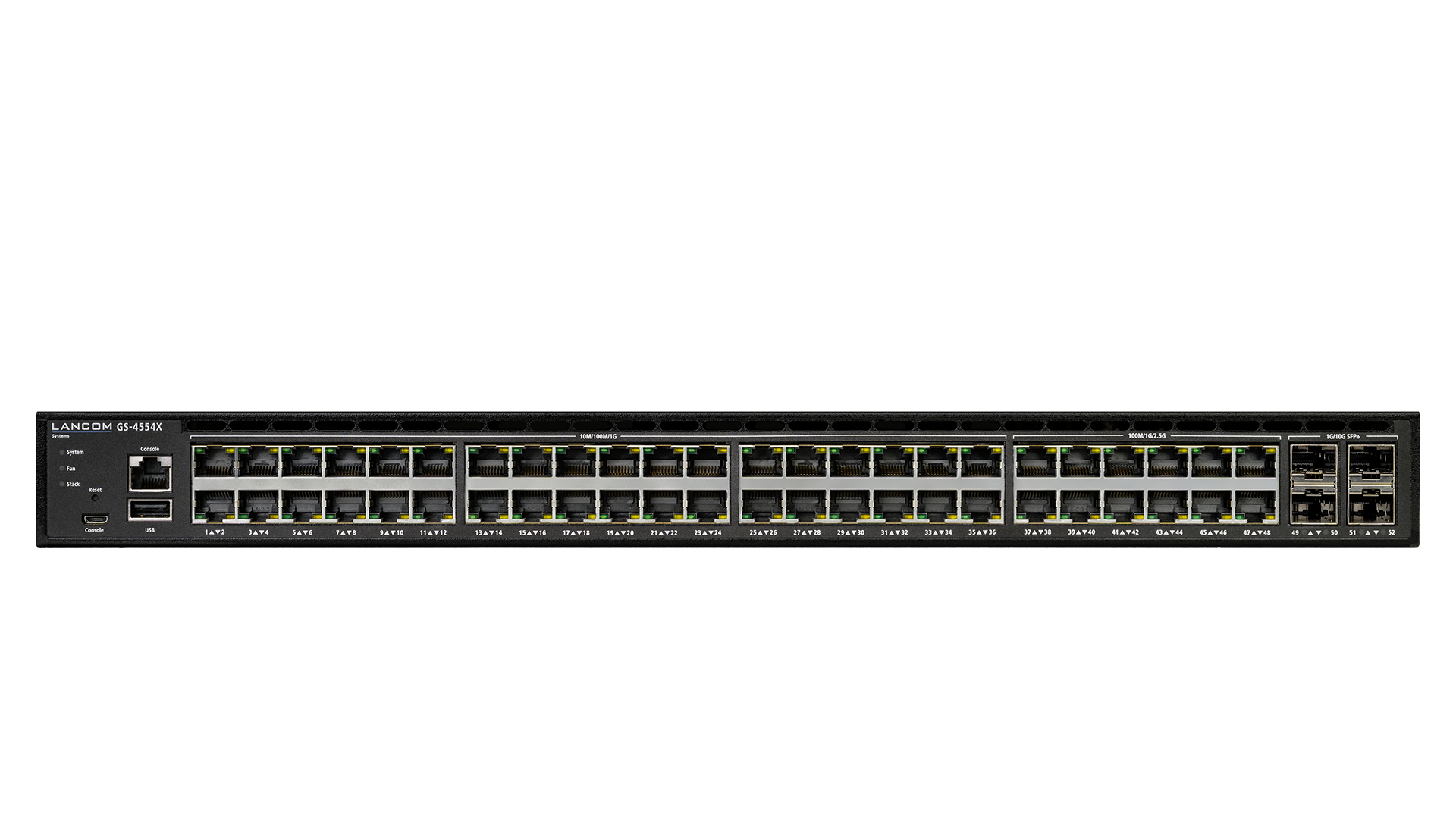 In Enterprise-Netzwerken mit einer hohen Anzahl an Komponenten ist dieser Fully Managed Multi-Gigabit Access Switch dank Full-Layer-3-Funktionen mit performantem Uplink und Stacking eine zuverlässige Lösung. Dabei bietet die umfangreiche Portausstattung nach Industriestandard höchste Leistung auch bei hoher Auslastung. Professionelle Redundanzfunktionen und das LANCOM Failsafe Stacking sorgen für einen ausfallsicheren Betrieb, während die LANCOM Limited Lifetime Warranty (LLW) den GS-4554X bestmöglich abgesichert. Seine Konfiguration erfolgt über die LANCOM Management Cloud automatisiert.