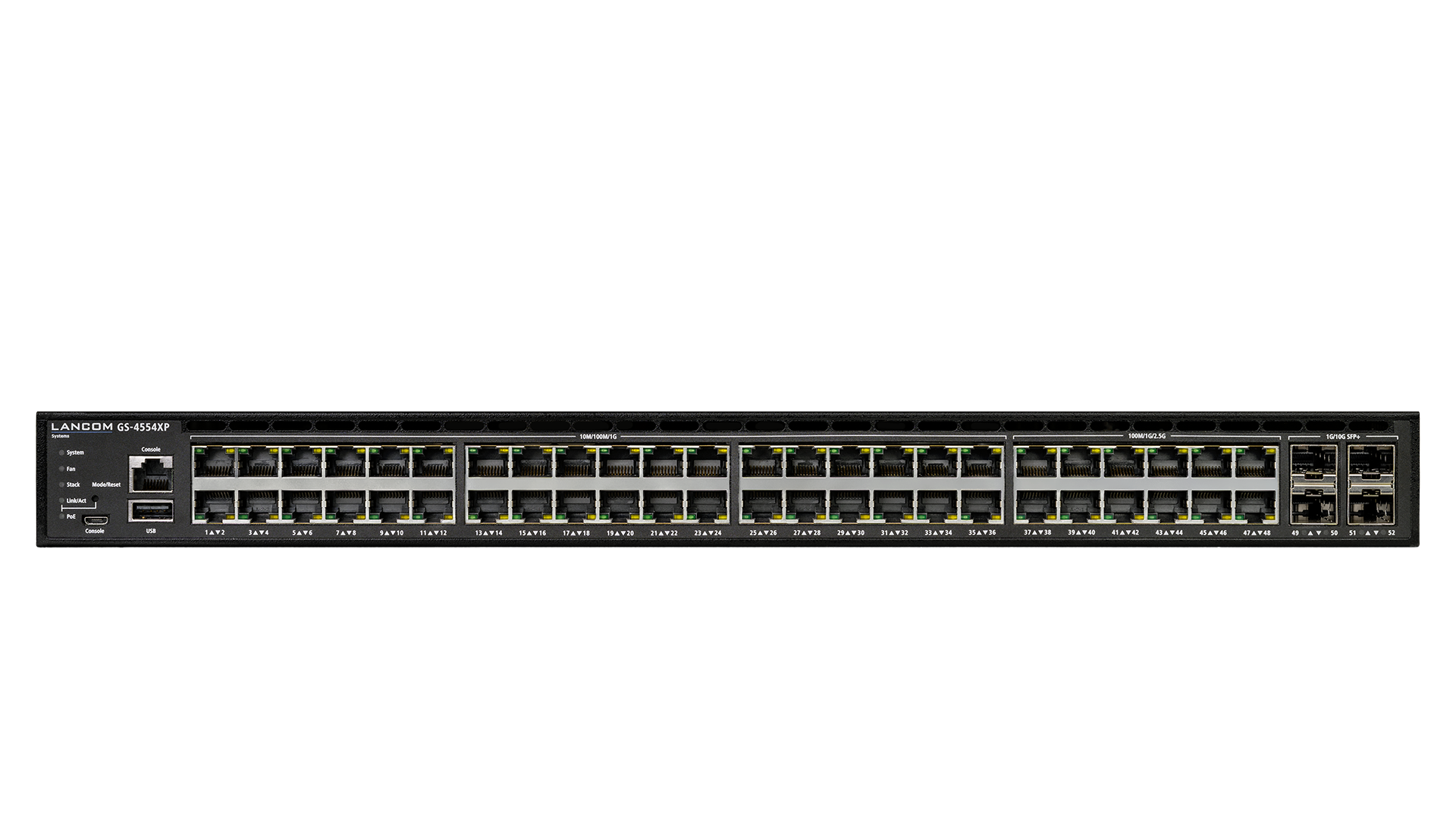 Der LANCOM GS-4554XP ist ausgestattet mit 12x 2,5 Multi-Gigabit PoE+ Ethernet-Ports, 36x Gigabit PoE+ Ethernet-Ports sowie 4 SFP+- und 2 QSFP+-FleX-Ports, die Übertragungsraten von 10 bzw. 40 GBit/s unterstützen. Zudem bietet er mit einem Datendurchsatz von 372 GBit/s auf der Backplane Wire-Speed-Performance auch bei hoher Auslastung. Damit bildet der Multi-Gigabit Access Switch die leistungsstarke Grundlage für moderne Netzwerkinfrastrukturen in sämtlichen Branchen und Einsatzbereichen.