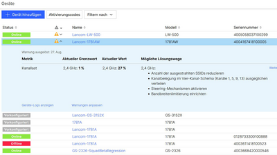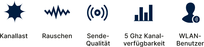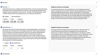Sie erhalten passgenaue Informationen zu den Metriken Kanallast, Rauschen, Sendequalität, WLAN-Benutzer und 5 GHz-Kanalverfügbarkeit und sind nur einen Klick von der Problembehebung auf dem betroffenen Gerät entfernt. Sind die Schwellwerte mehrerer Metriken überschritten, werden diese in einer gebündelten Übersicht angezeigt.