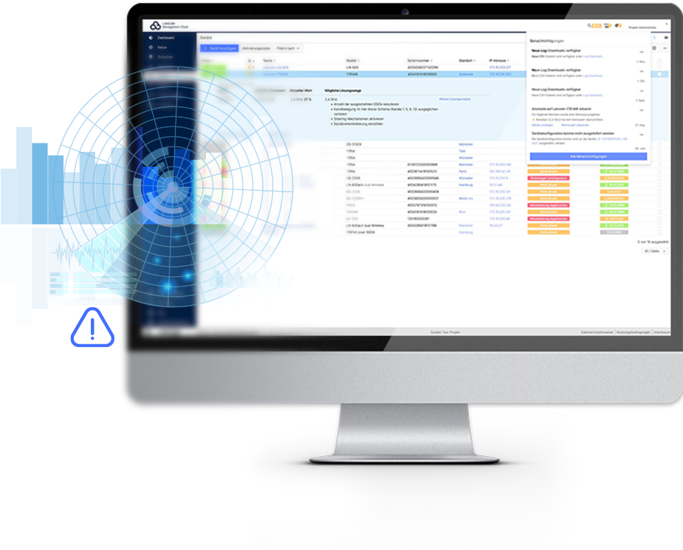 Bei Auffälligkeiten erhalten Sie eindeutige Warnhinweise sowohl direkt in der LANCOM Management Cloud als auch per E-Mail. Dabei lässt ein intuitives Farbsystem sofort erkennen, um welche Art von Meldung es sich handelt. So können Sie unmittelbar und zielgerichtet reagieren.