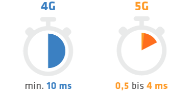 Echtzeitübertragung ist mit 5G kein Zukunftsszenario mehr: 5G sorgt mit nur wenigen Millisekunden bis unter einer Millisekunde für minimalste Zeit­verzögerungen (Latenzen) in der Datenübertragung. Durch die Nutzung des 5G-Standards wird so pro übertragener Datenmenge gegenüber älteren Standards Energie gespart und eine höhere Effizienz erreicht.