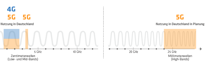 Neu ist, dass für 5G-Netze auch der Frequenzbereich oberhalb von 24 GHz geplant ist (FR2), um dem Anspruch nach hohen Datenraten gerecht zu werden. Dieser Millimeterwellenbereich (mmWaves) wird in Deutschland – anders als in anderen europäischen Ländern – allerdings erst in einigen Jahren zur Verfügung stehen.