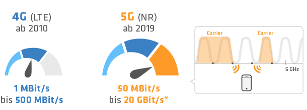 *Hinweis: Es handelt sich hier um Maximalgeschwindigkeiten unter Idealbedingungen, die in der Praxis nicht immer erreicht werden können. Derzeit werden in deutschen 5G-Netzen Datenraten zwischen 50 MBit/s und 1,5 GBit/s in Abhängigkeit von Frequenz, Carrier Aggregation, Kanalband­breite und Modulation erreicht.