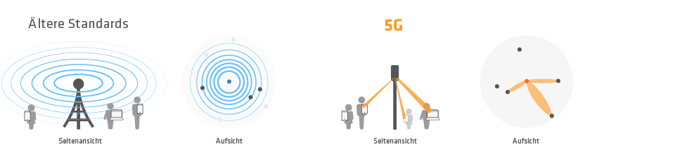 Realisiert wird dies durch intelligente Antennen- und Zellensysteme, die 3D-Beamforming verwenden. Im Gegensatz zu passiven Antennen älterer Standards steuern die aktiven 5G-Zellen ihre Signalleistung nach Bedarf zielgerichtet und strahlenförmig. Dadurch werden Randbereiche mit stärkeren Signalen versorgt und eine flexiblere Reaktion auf den jeweiligen Netzbedarf gesichert. So wird nur dann Sendeleistung und damit Strahlung abgerufen, wenn sie benötigt wird.