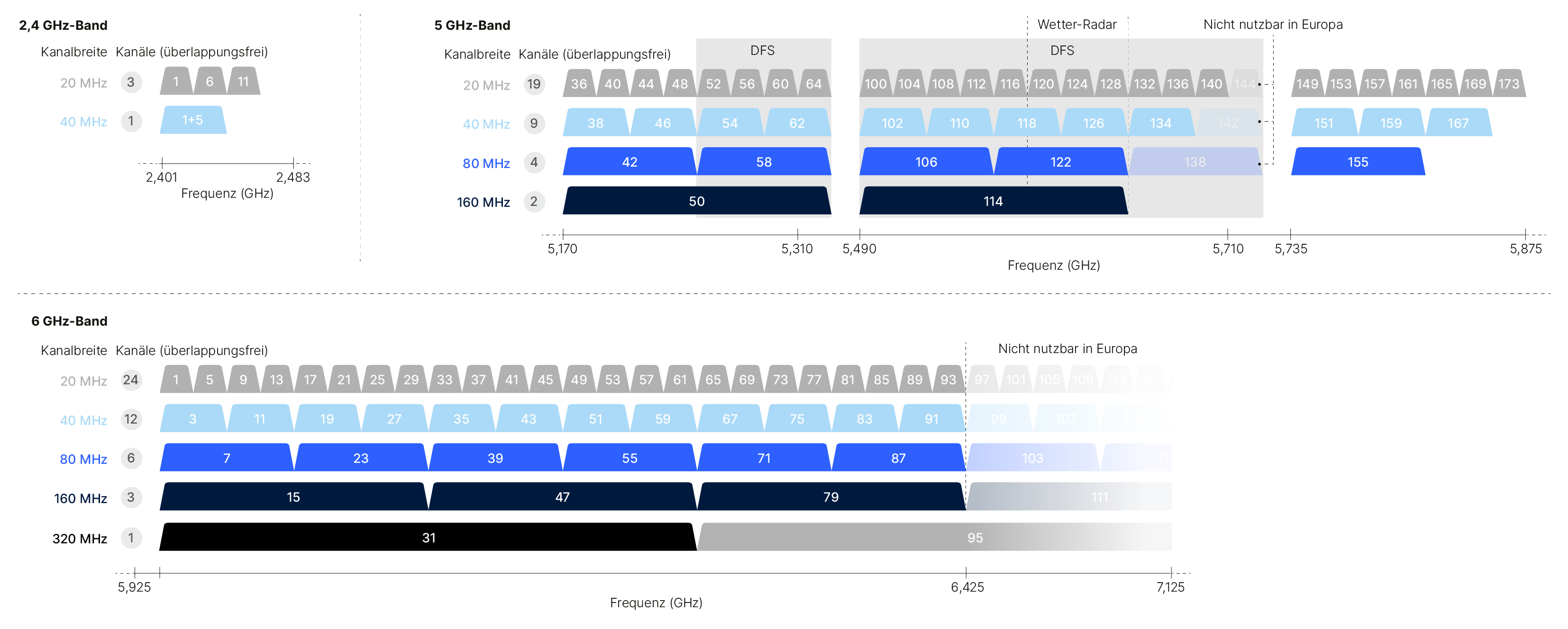 Wi-Fi 7 setzt wie bereits Wi-Fi 6E zusätzlich zum 2,4 und 5 GHz-Band auf das 6 GHz-Frequenzband. Während das 2,4 und 5 GHz-Band von anderen Funktechnologien oder Primärnutzern, wie z. B. Babyphones und Mikrowellen, mitgenutzt werden kann, ist das hochfrequente 6 GHz-Spektrum für die exklusive WLAN-Nutzung bestimmt. Dadurch sind störungsfreiere WLAN-Verbindungen mit minimalsten Latenzen bei maximalem Datendurchsatz möglich. Insbesondere reaktionsschnelle Verbindungen und zeitkritische WLAN-Anwendungen profitieren davon.