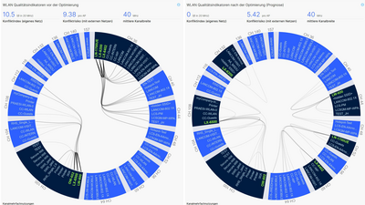 Ein Dashboard visualisiert sowohl den Ist-Zustand inklusive vorhandener Kanalmehrfachbelegungen durch Fremdnetze als auch eine Simulation des prognostizierten optimierten Netzes. Der Vorher-Nachher-Vergleich macht Verbesserungspotenziale auf einen Blick sichtbar und erlaubt ein risikofreies Austesten der Optimierungsoptionen. Administratoren behalten so jederzeit die volle Kontrolle. Sobald die Optimierung übernommen werden soll, genügt ein Klick und die Konfigurationen werden automatisch angepasst.