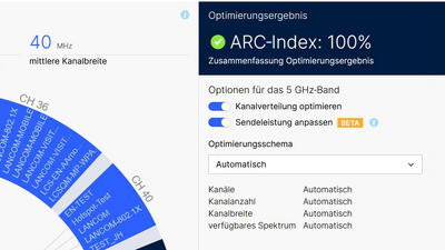 Der zu erwartende WLAN-Optimierungsgrad wird mit Hilfe des ARC-Indexes auf einer Skala von bis zu 100% abgebildet. So erkennen Sie auf einen Blick, welchen Effizienz- und Leistungssprung Ihr WLAN dank LANCOM Active Radio Control™ 2.0 gemacht hat. Mit dem praktischen Auto-Modus von LANCOM Active Radio Control 2.0™ brauchen Sie dafür nur zwei Klicks, mit denen Sie Ihr WLAN zunächst "scannen" und die Verbesserungen dann "übernehmen und ausrollen".