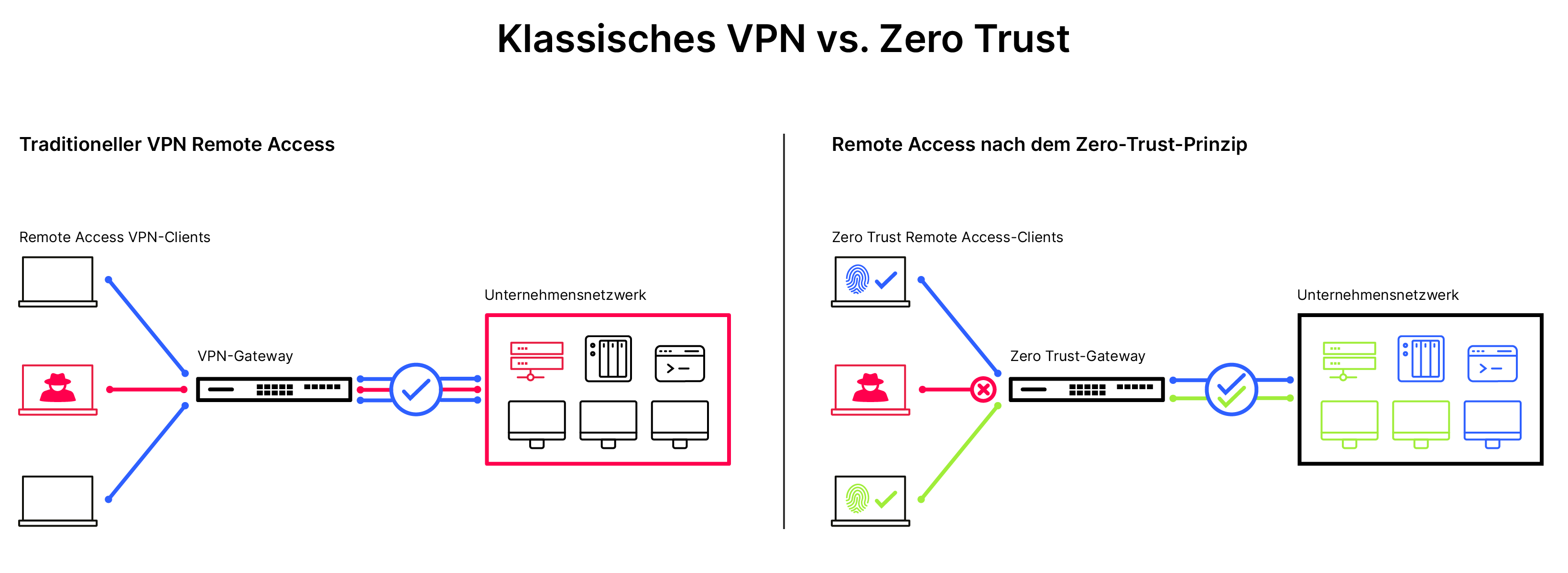 Im Vergleich zu einem klassischen Netzwerk unterscheidet sich das Zero-Trust-Prinzip dadurch, dass Benutzern oder Geräten kein Zugriff auf gesamte Netze, sondern ausschließlich auf bestimmte Anwendungen oder Netzwerkressourcen gewährt wird.