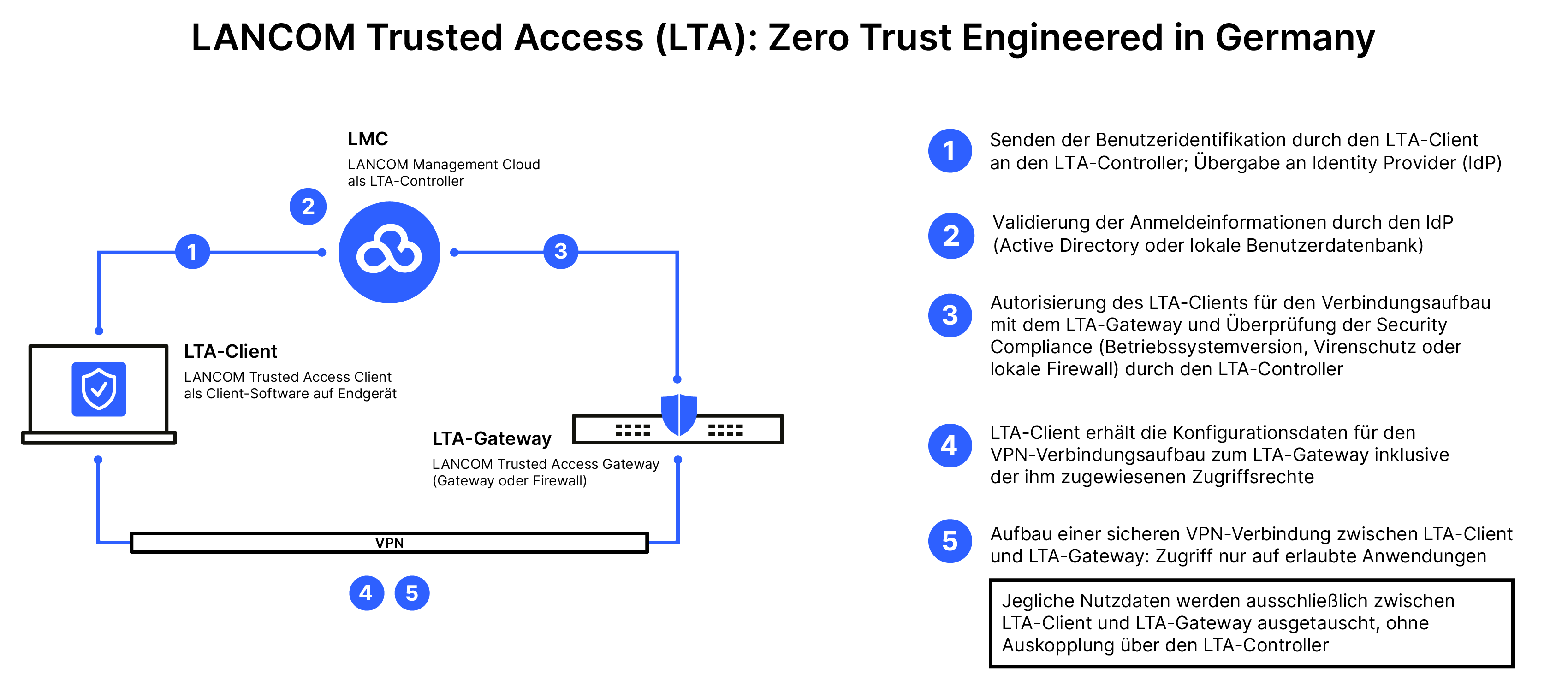 Dennoch sollte das Zero-Trust-Prinzip auch vom Klang her ein Sicherheitsgefühl wecken, statt Unbehagen, und ebenso alle Sorgen und Belange der Nutzer mit einbeziehen. Aus diesem Gedanken heraus ist LANCOM Trusted Access (LTA) entstanden.