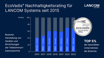 Bei LANCOM sind Nachhaltigkeit und die Übernahme von Verantwortung seit vielen Jahren ein fester Bestandteil der Unternehmenspraxis. Die Silbermedaille von EcoVadis®, die uns als eines der führenden Unternehmen in der Herstellung von Geräten und Einrichtungen der Telekommunikationstechnik auszeichnet, bestätigt uns auf diesem Weg. Mit dieser Bewertung gehören wir zu den Top 5% der von EcoVadis® beurteilten Unternehmen in unserer Branche.